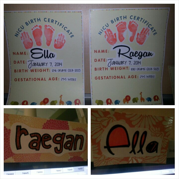 I love coming into the girls’ room in the morning and finding surprises. Today, we had lots of new surprises, including new nameplates for the girls’ monitors and their birth certificates, complete with tiny hand and foot prints. We’d already been given a copy of their foot prints, but it’s nice to have everything together. It will be amazing to show the girls how small they once were.