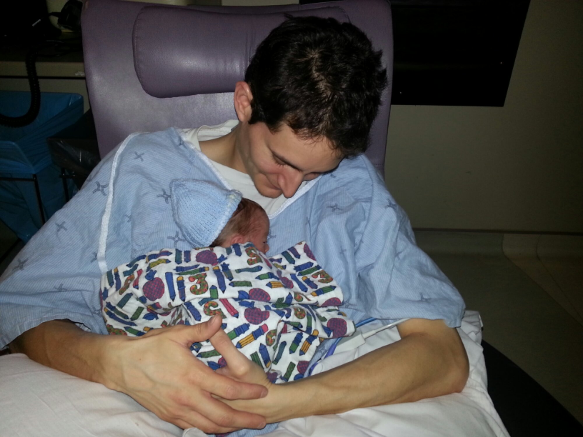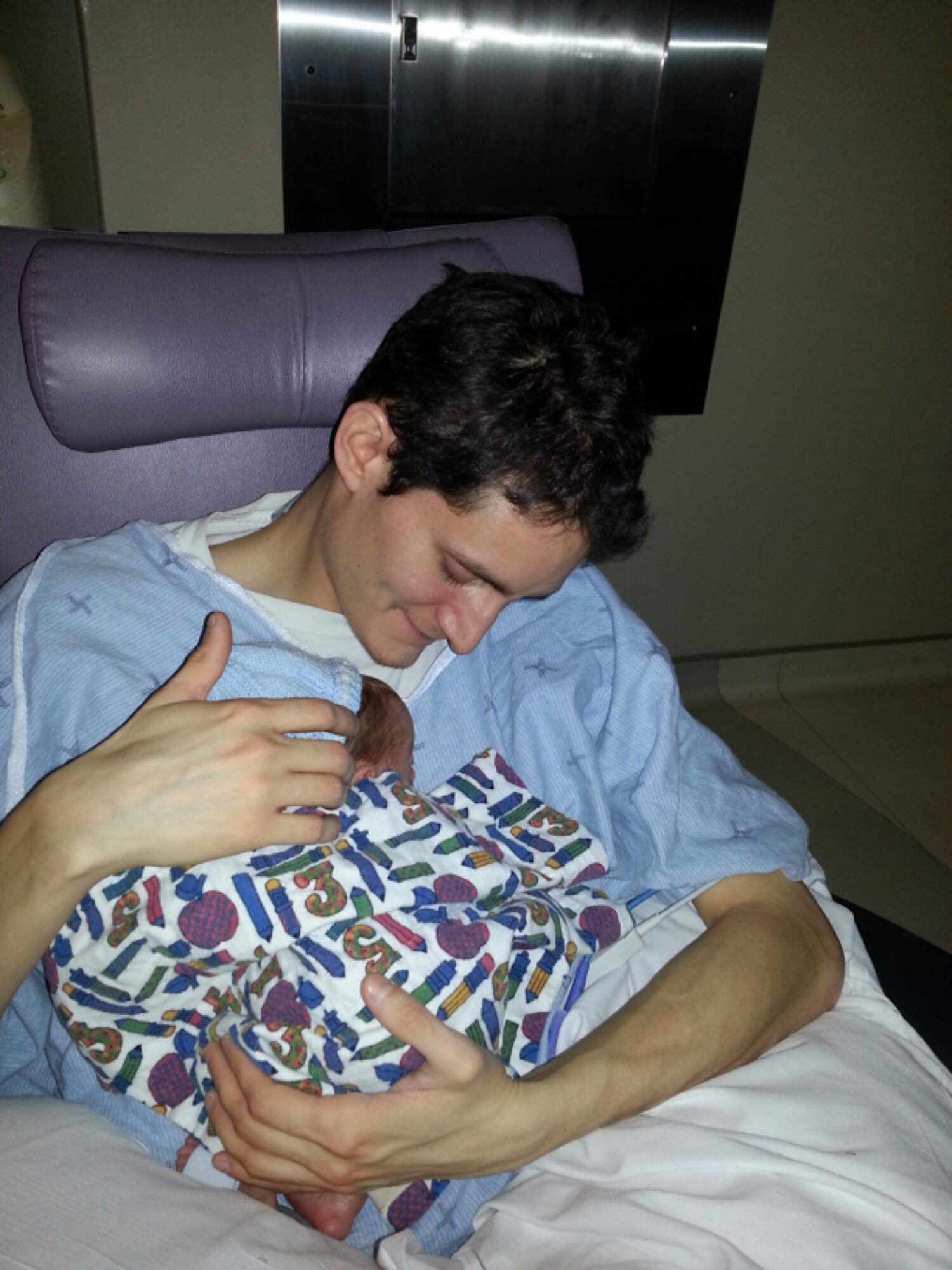 Since his side is still sore, and he is feeling both a bit anxious and nervous, he decided not to do skin to skin, but still got to hold her wrapped in a blanket. Ella, the budding fashionista that she is, was also rocking an adorably teeny pink onesie t-shirt.