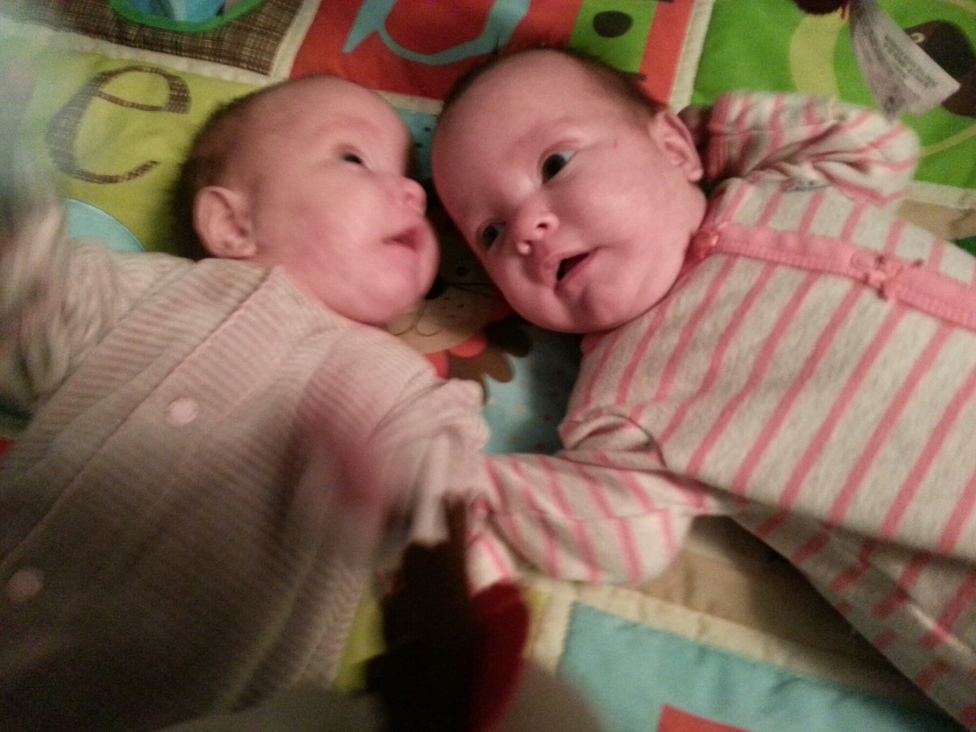 Ella rolled over today! I put the girls on their bellies and she fully flipped herself to her back. I put her back on her tummy and she rolled from side to side but didn’t flip. I have a feeling this lady has some serious tricks up her sleeve.