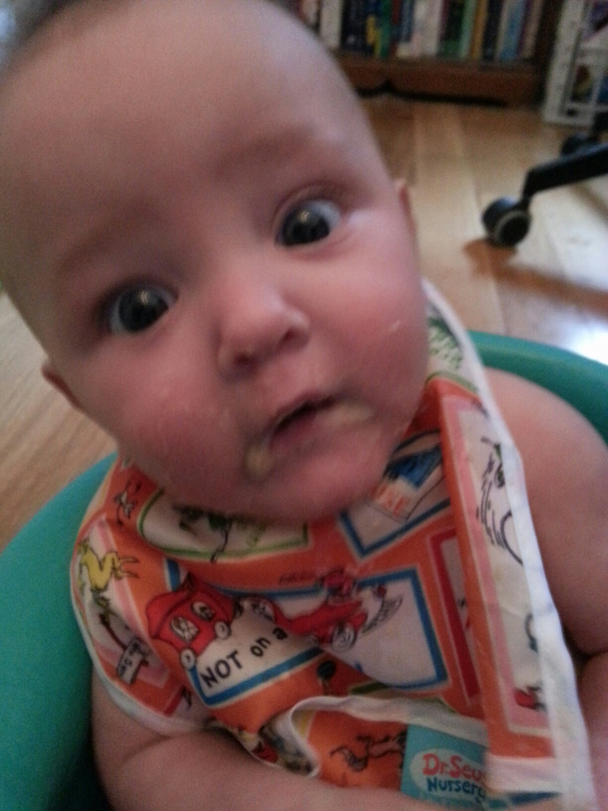 Two pediatricians told us she was ready for solids, and I pushed back, mumbling about the guidelines, but they said she was ready, point blank. So, I thought about it and after her week, I got some cereal and shovelled it into her. She loved it. She has eaten her entire bowl and didn’t do the usual spitting out or grimacing face. She is a born eater, anticipating the food and opening up for the ooey gooey goodness. It’s hilarious to see and I can finally say that she’s sleeping, in her crib.