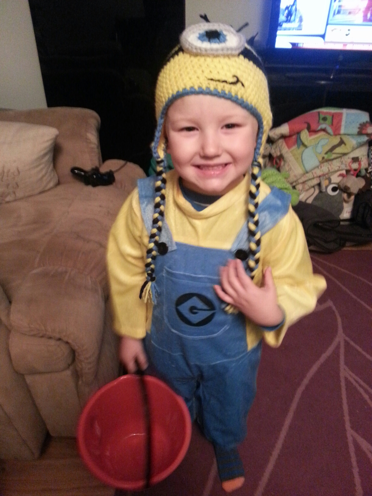Last month I asked Braeden what he wanted to be for Hallowe’en and gave him a few suggestions. His pick: minion! It’s funny because he had never actually seen Despicable Me, but loves Pharrell’s song Happy, and there are minions in the video that he loves.