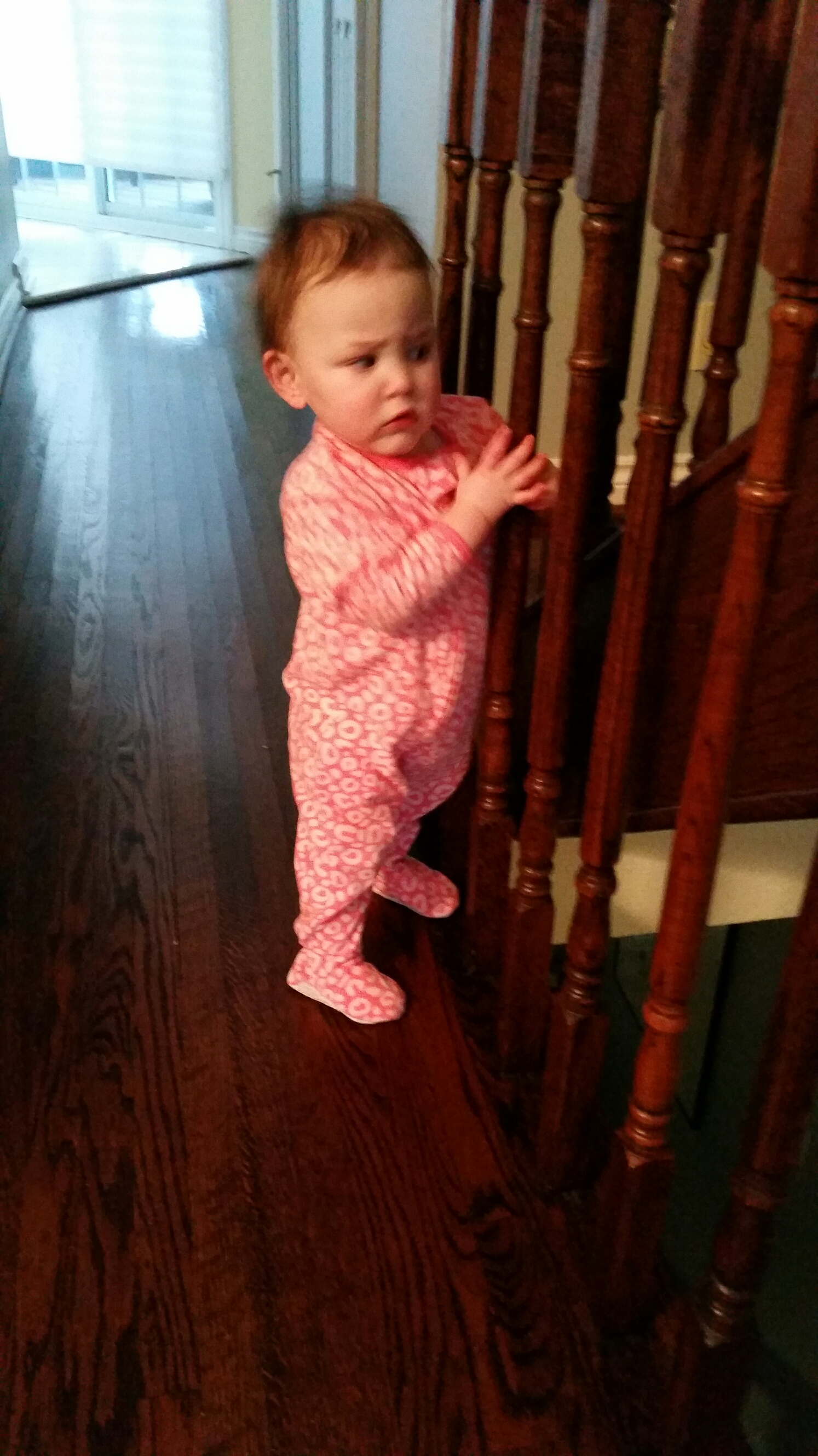 Raegan is pretty much ready to pack a bag and move out. She’s thisclose to walking and I expect by next month’s update, she will be trotting along. For now, she’s pulling up and cruising at every chance she gets, and gets into EVERYTHING. She can stand on her own for a bit, but prefers to be on the move. She has two top molars and is getting her bottom ones and another front bottom tooth. That makes almost 9. Maybe more, she doesn’t really let me look. She says Mama, Dada, I did it!, yah, and wow. She’s a pretty good mimic. She still loves food and snacks. My dad couldn’t believe how many meatballs she had at Easter, but she often eats a portion size almost as big as mine yet stays so Itty Bitty.