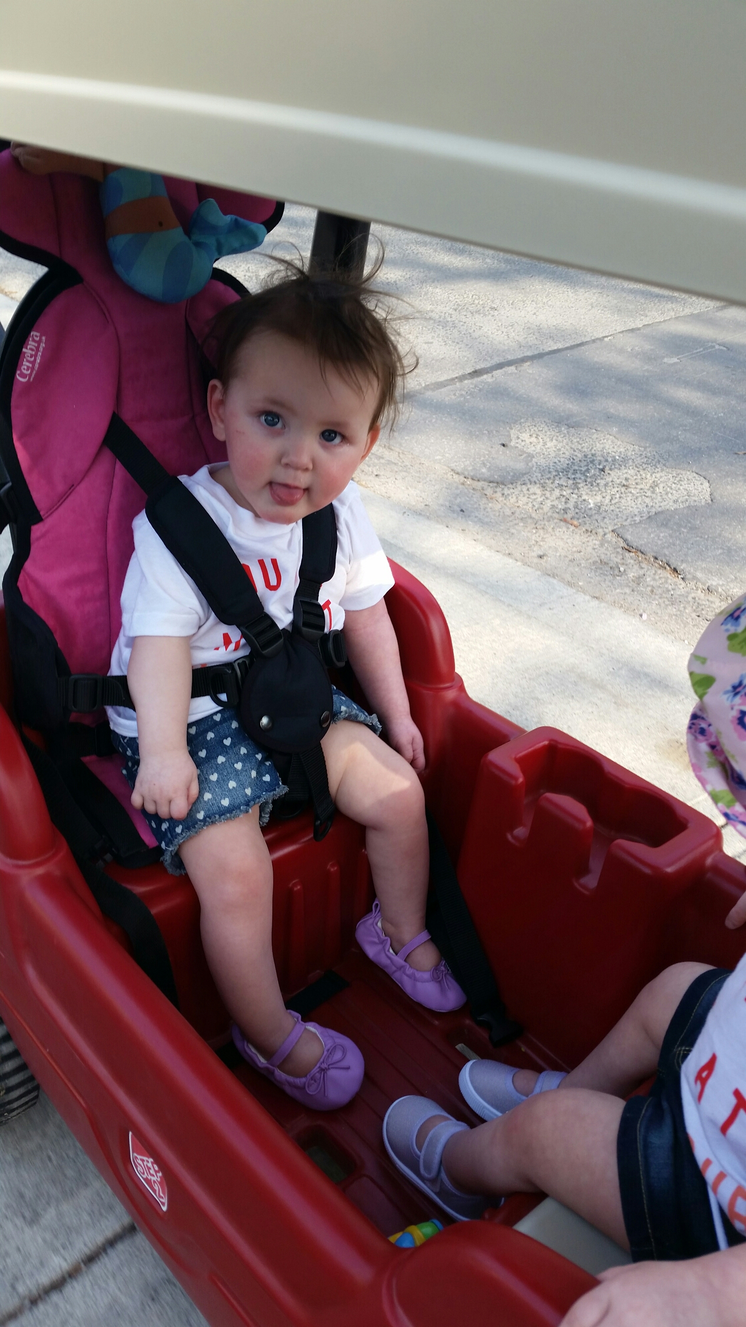 Ella has started her Conductive Education class and had her second one today. She cried, but did so much better than last week, including sitting cross-legged with support and bearing weight on her legs while standing supported. She was quite tuckered out after from all her hard work! She also got to ride in our wagon for the first time with her adapted seat from Firefly. She was not a fan at first, but once I took her hat off, she loved it.