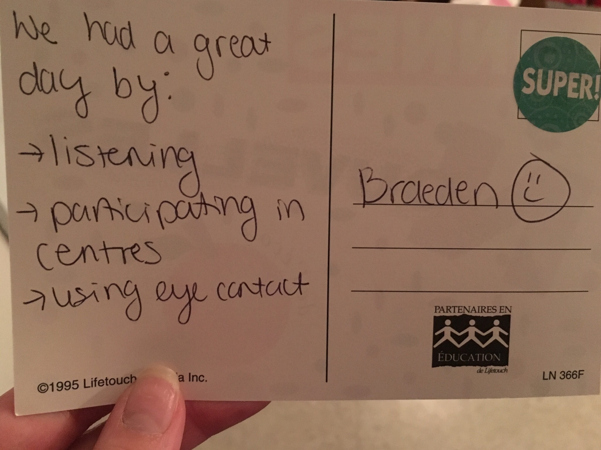 Tonight, Braeden excitedly told me he had a surprise for me, when he showed me his first postcard! The look of pride on his face was so incredible and I was so proud of him and happy that he has a moment like this to encourage him to keep up the good work, and really, a moment for me to remind myself that parenting is hard work that even the experts struggle with, and that it’s the little things like this postcard that will keep us both motivated and reminded that we can handle this crazy ride.
